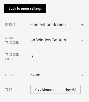 Выбирай между пятью видами пошаговой анимации: элемент на экране, блок на экране, анимация по скроллу, ховеру или клику